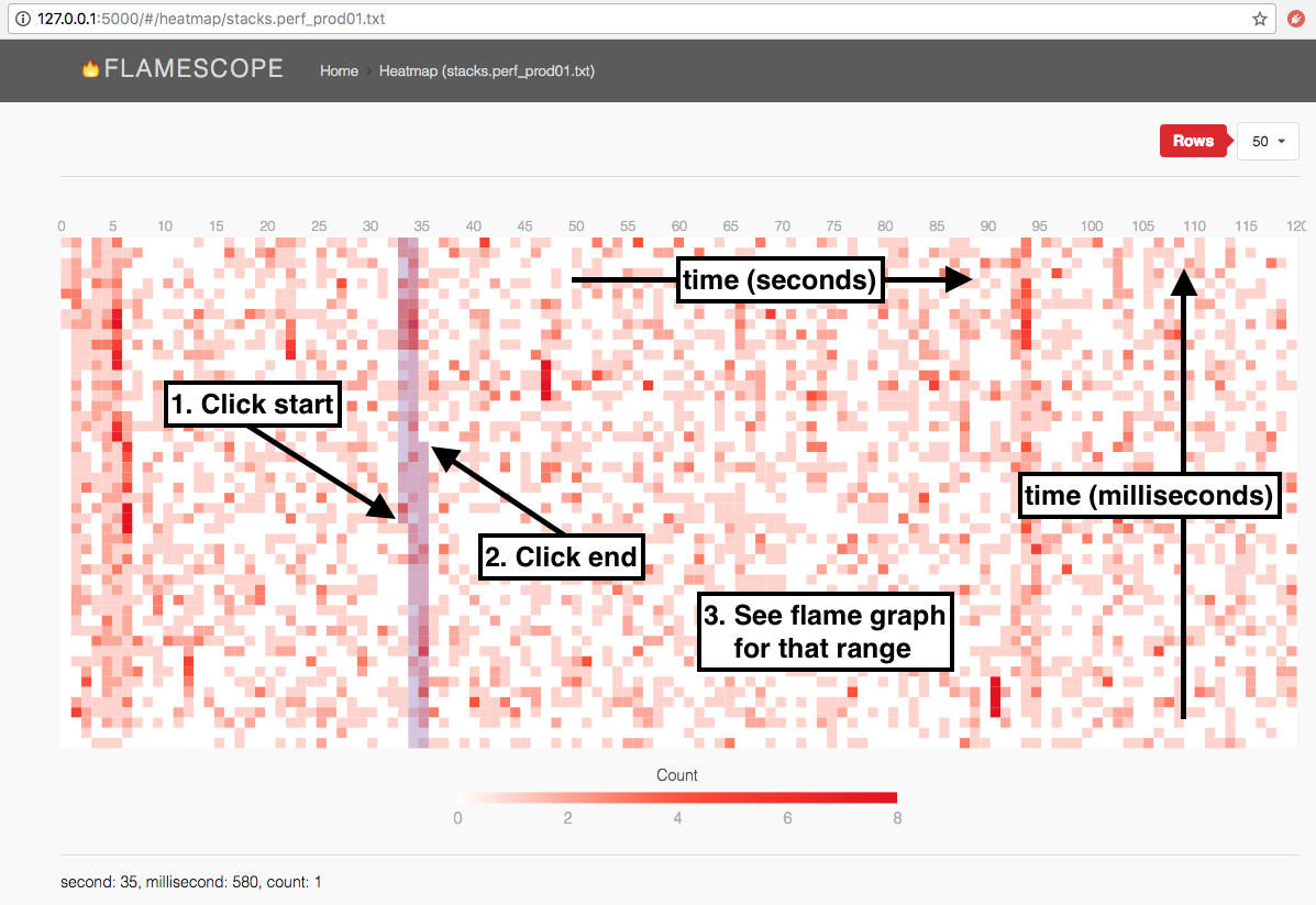 Time in on both axes. Samples are grouped into time-range buckets, drawn as colored blocks, where the color shows how many samples fell into that time range: darker for more. These buckets are painted from bottom to top in a column, and then the next column and so on, as shown in the diagram on the right. By default FlameScope arranges these as a subsecond offset heat map, where each column is one full second and each of the 50 rows spans a 20ms slice. The end user can then select a time range in the heat map, and a flame graph is generated for just that time range. This allows perturbations and variations to be easily seen in the heat map, selected, and their responsible code paths studied.