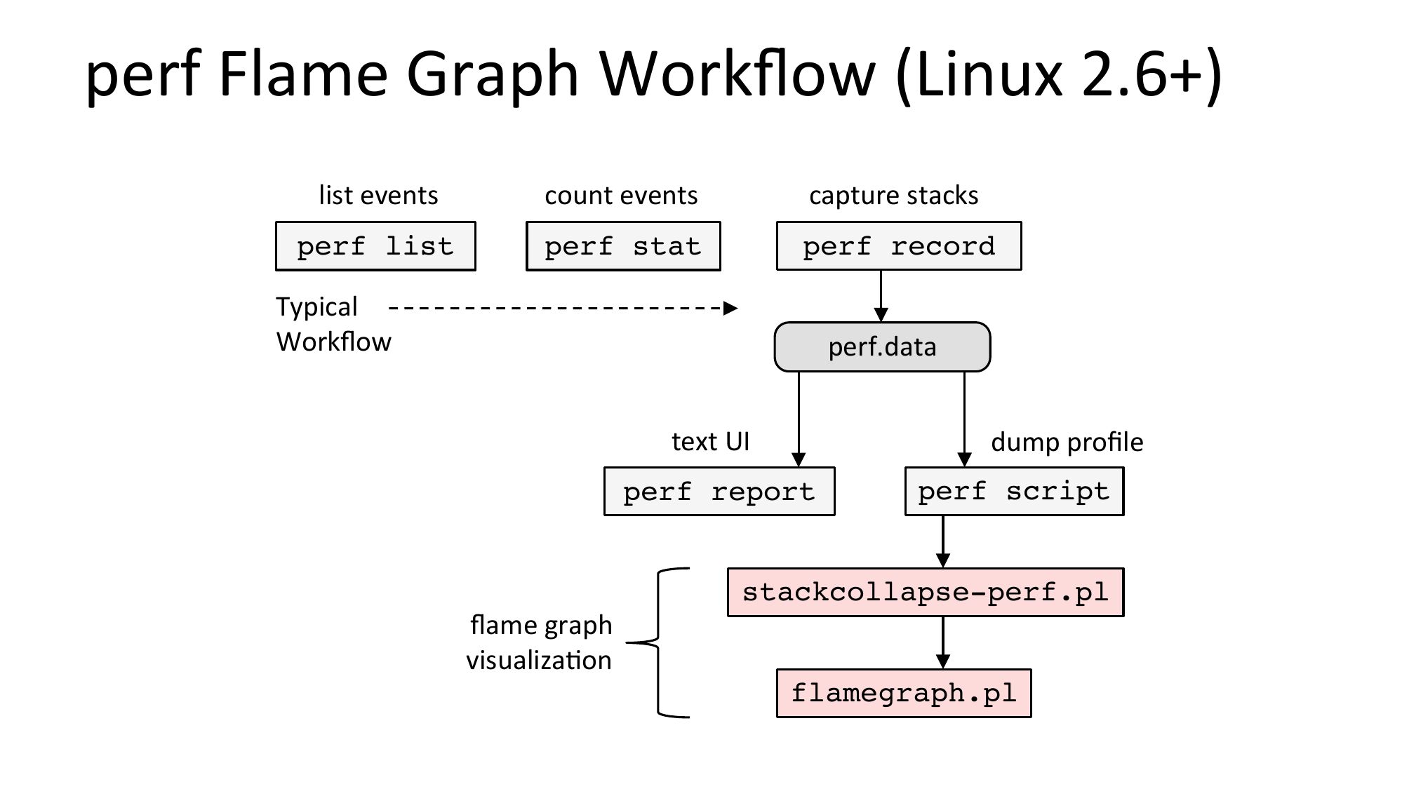 perf Flame Graph Workflow (Linux 4.5+) list events count events capture stacks perf list perf stat perf record Typical Workflow perf.data text UI dump perf report perf script flame graph visualiza/on summary perf report -g folded awk flamegraph.plslide 39:
