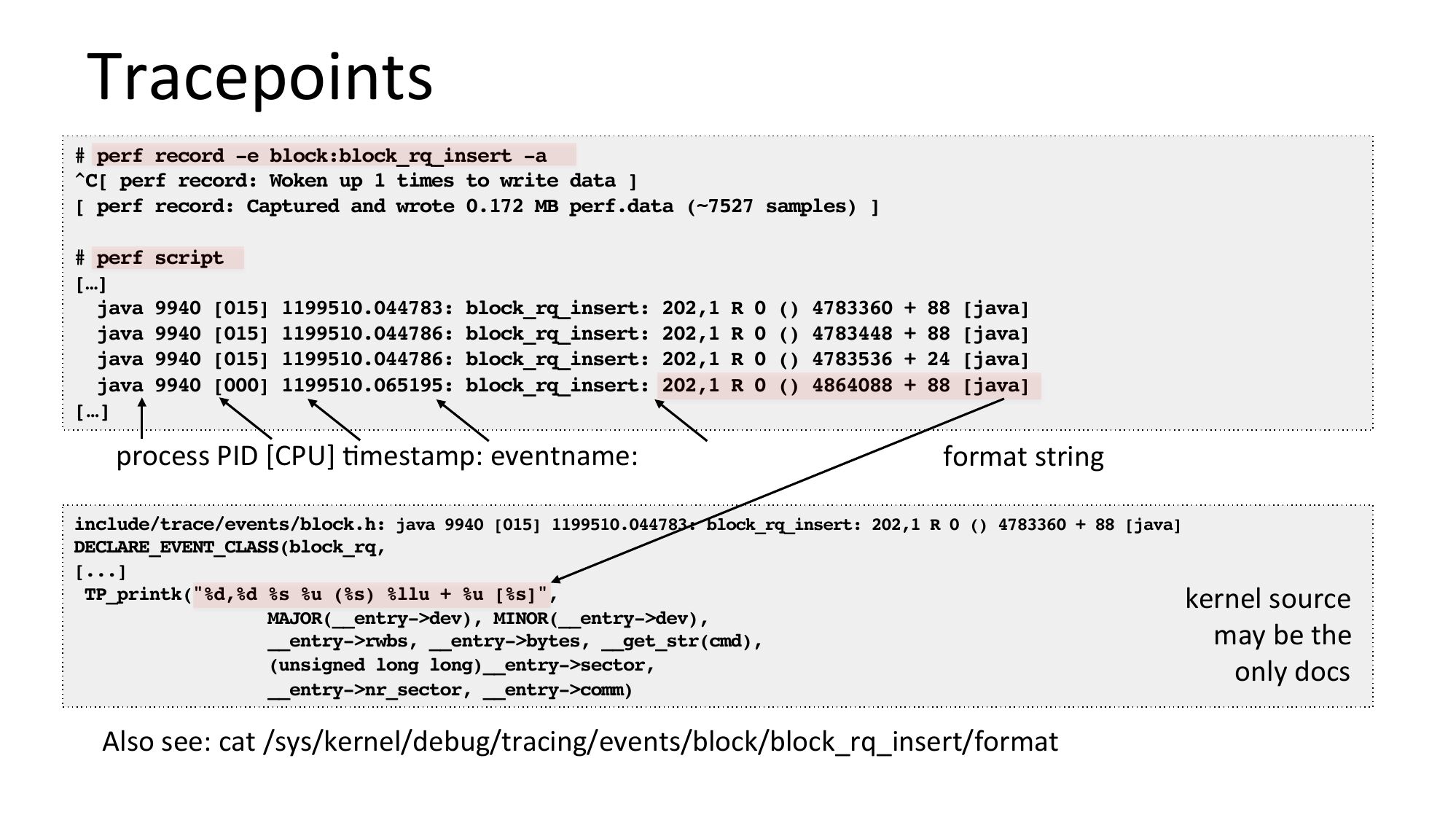 Basic Workflow Example # perf list sched:* […] sched:sched_process_exec [Tracepoint event] […] # perf stat -e sched:sched_process_exec -a -- sleep 10 Performance counter stats for 'system wide': sched:sched_process_exec 1. found an event of interest 2. 19 per 10 sec is a very low rate, so safe to record 10.001327817 seconds time elapsed # perf record -e sched:sched_process_exec -a -g -- sleep 10 [ perf record: Woken up 1 times to write data ] [ perf record: Captured and wrote 0.212 MB perf.data (21 samples) ] # perf report -n --stdio # Children Self Samples Trace output # ........ ........ ............ ................................................. 4.76% 4.76% 1 filename=/bin/bash pid=7732 old_pid=7732 ---_start return_from_SYSCALL_64 do_syscall_64 sys_execve do_execveat_common.isra.35 […] # perf script sleep 7729 [003] 632804.699184: sched:sched_process_exec: filename=/bin/sleep pid=7729 old_pid=7729 44b97e do_execveat_common.isra.35 (/lib/modules/4.13.0-rc1-virtual/build/vmlinux) 44bc01 sys_execve (/lib/modules/4.13.0-rc1-virtual/build/vmlinux) 203acb do_syscall_64 (/lib/modules/4.13.0-rc1-virtual/build/vmlinux) acd02b return_from_SYSCALL_64 (/lib/modules/4.13.0-rc1-virtual/build/vmlinux) c30 _start (/lib/x86_64-linux-gnu/ld-2.23.so) […] 3. 21 samples captured 4. summary style may be sufficient, or, 5. script output in /me orderslide 19: