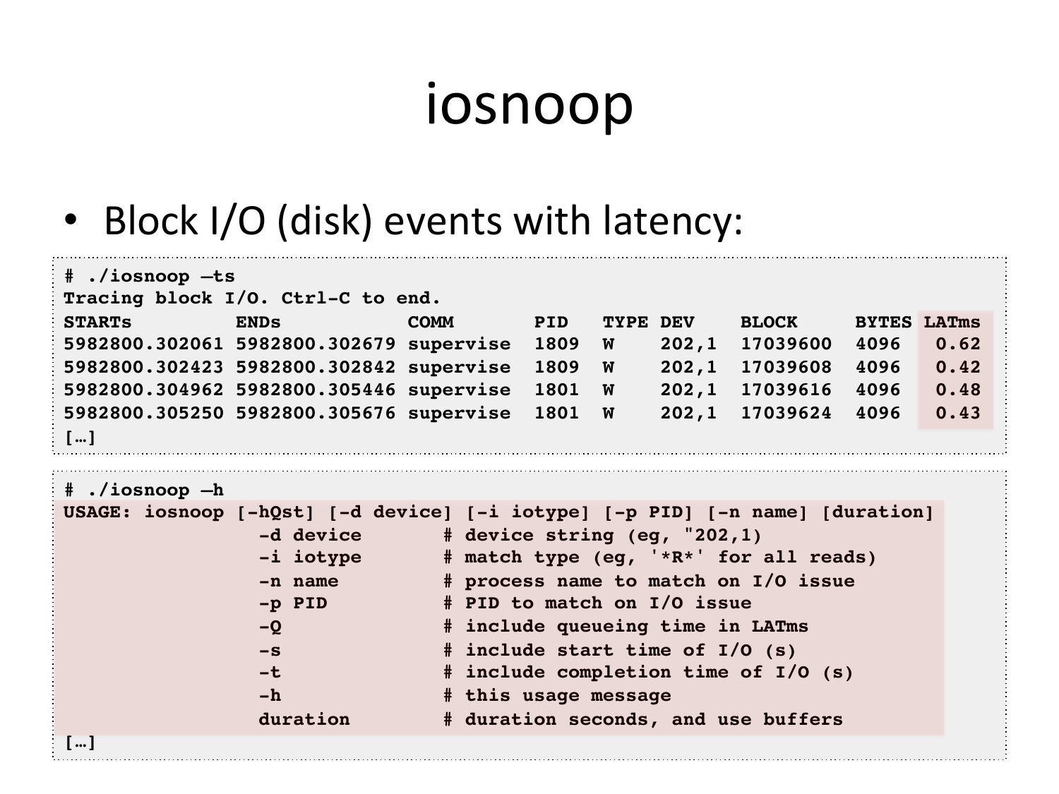 Imagine Linux with Tracing • With a programmable tracer, high level tools can be wriken, such as: – iosnoop – iolatency – opensnoop – …slide 65:
