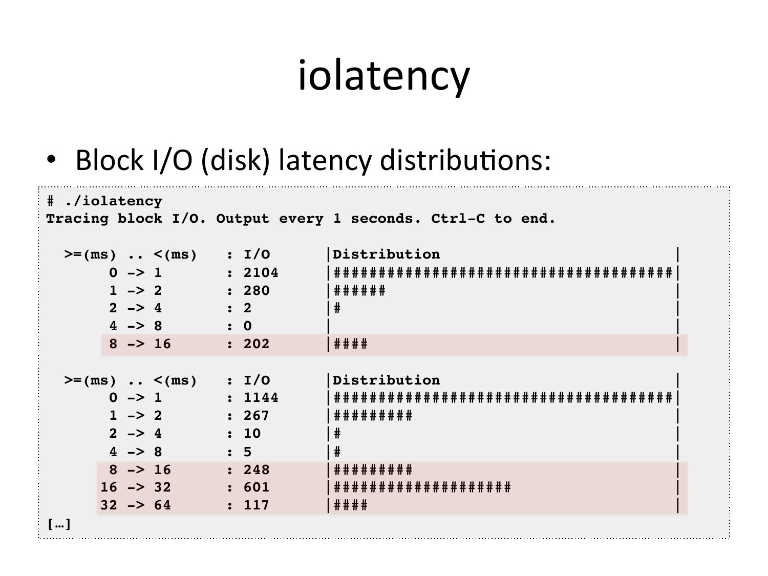 iolatency • Block I/O (disk) latency distribuVons: # ./iolatency ! Tracing block I/O. Output every 1 seconds. Ctrl-C to end.! >gt;=(ms) ..slide 67:gt; 1 : 2104 |######################################|! 1 ->gt; 2 : 280 |###### 2 ->gt; 4 : 2 4 ->gt; 8 : 0 8 ->gt; 16 : 202 |#### >gt;=(ms) .. gt; 1 : 1144 |######################################|! 1 ->gt; 2 : 267 |######### 2 ->gt; 4 : 10 4 ->gt; 8 : 5 8 ->gt; 16 : 248 |######### 16 ->gt; 32 : 601 |#################### 32 ->gt; 64 : 117 |#### […]!