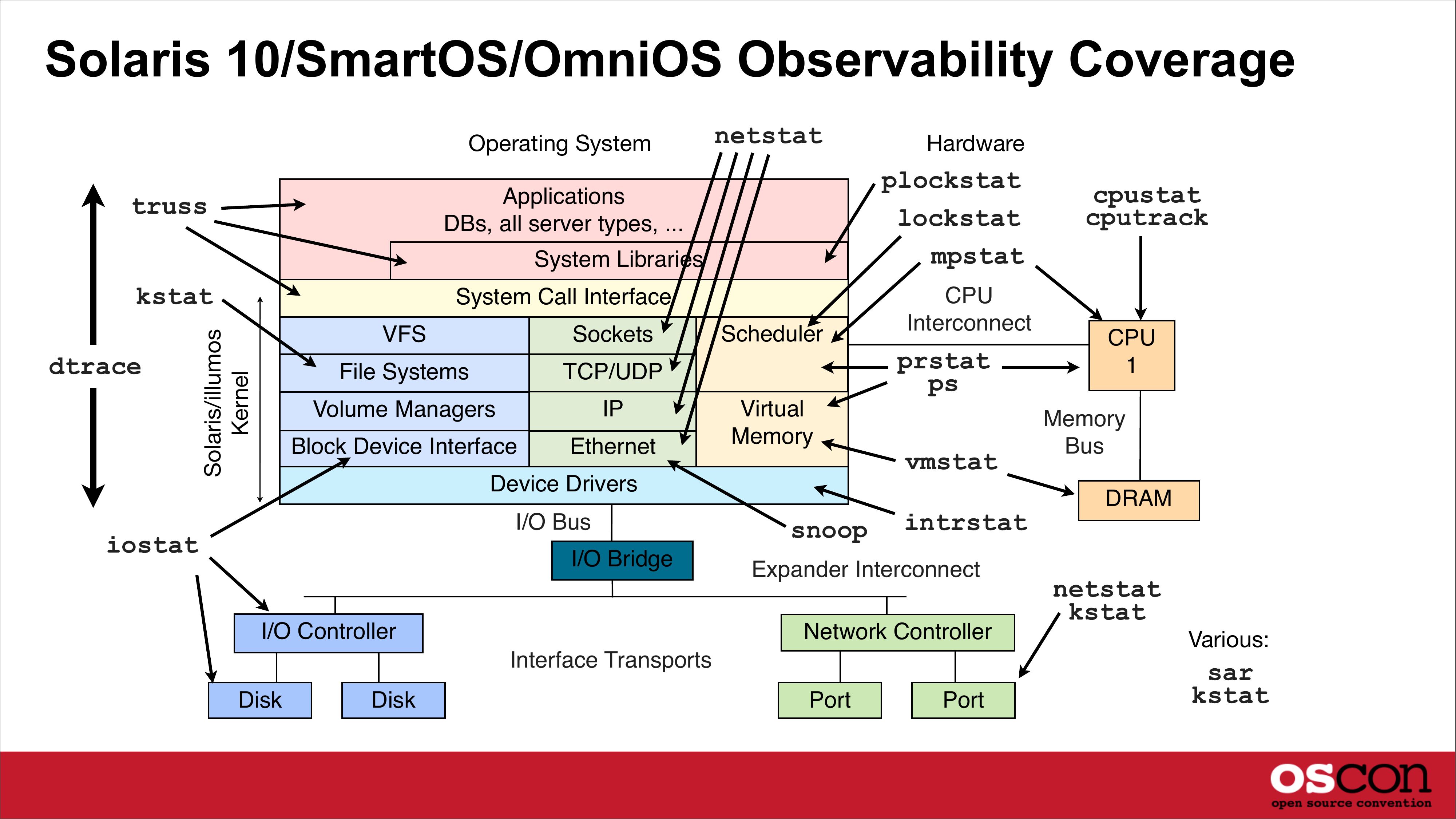 Solaris 9 Observability Coverage apptrace Operating System netstat sotruss lockstat mpstat Applications DBs, all server types, ... truss System Libraries kstat Hardware Solaris Kernel System Call Interface VFS Sockets File Systems TCP/UDP Volume Managers Block Device Interface Ethernet Scheduler prstat Virtual Memory Device Drivers I/O Bus iostat prex I/O Bridge I/O Controller CPU Interconnect vmstat Disk CPU Memory Bus DRAM snoop Expander Interconnect Network Controller Interface Transports Disk cpustat cputrack Port Port netstat kstat Various: sar kstatslide 11: