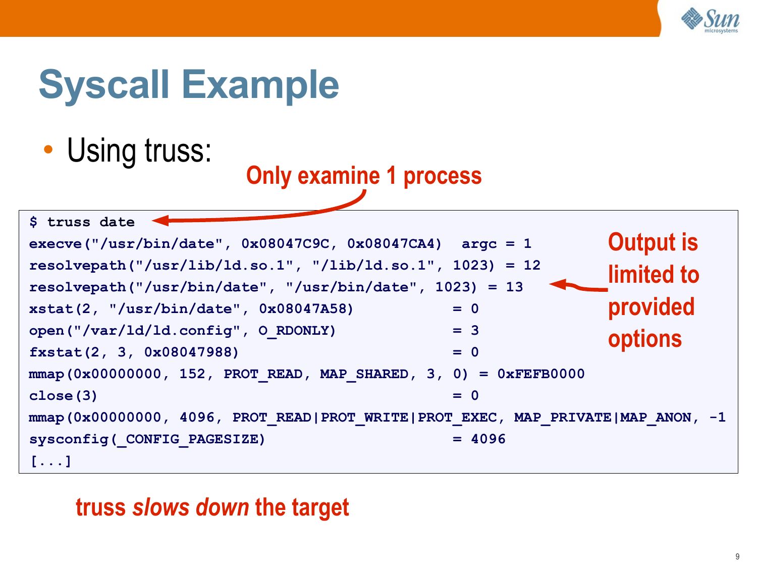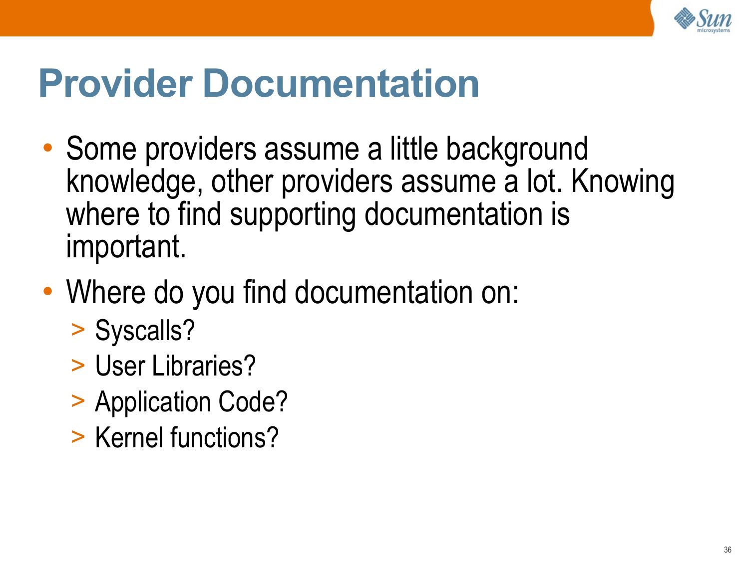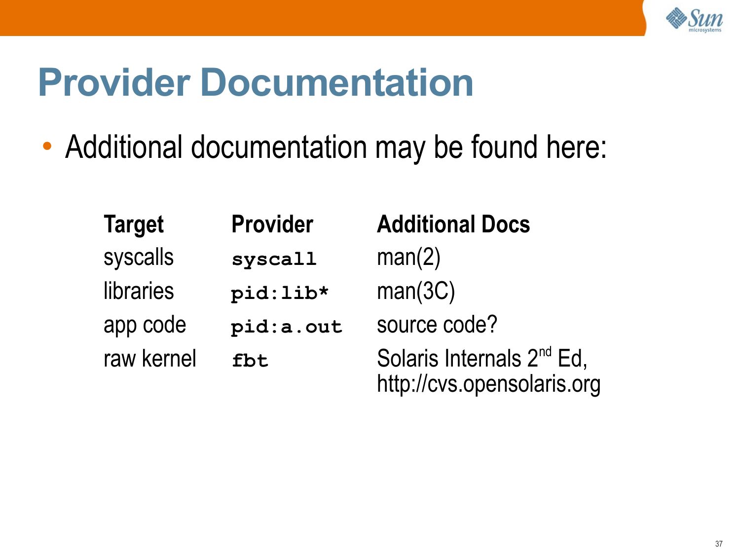 Provider Documentation • Some providers assume a little background knowledge, other providers assume a lot. Knowing where to find supporting documentation is important. • Where do you find documentation on: >gt; Syscalls? >gt; User Libraries? >gt; Application Code? >gt; Kernel functions?slide 37:
