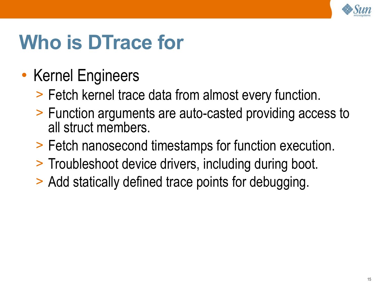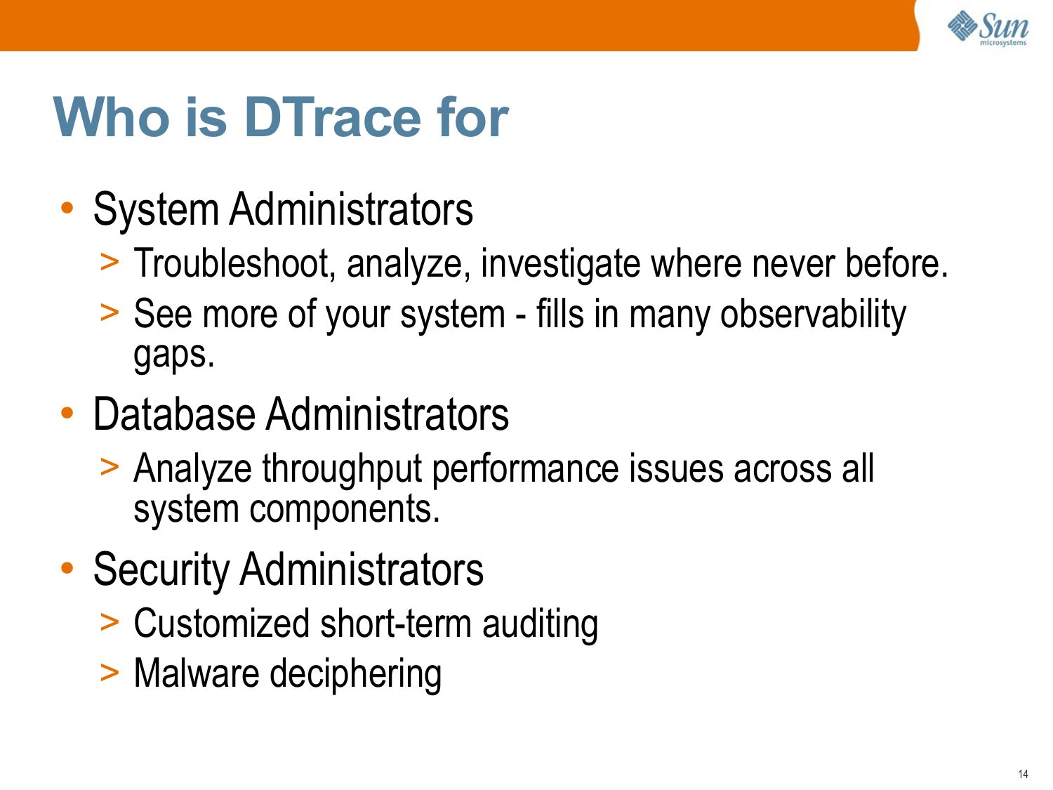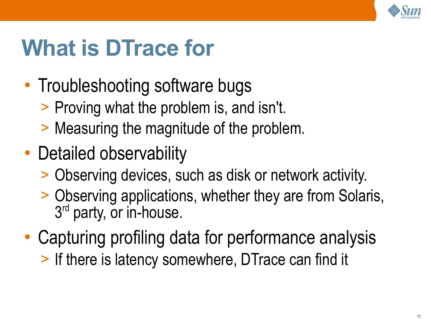 slide 2:DTrace Topics: Introduction • This presentation is an introduction to DTrace, and is part of the “DTrace Topics” collection. >gt; Difficulty: >gt; Audience: Everyone • These slides cover: >gt; What is DTrace >gt; What is DTrace for >gt; Who uses DTrace >gt; DTrace Essentials >gt; Usage Featuresslide 3: