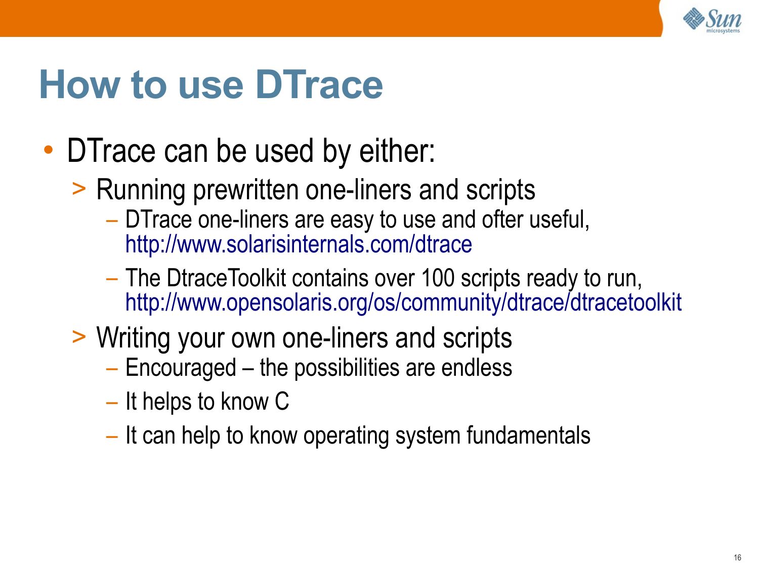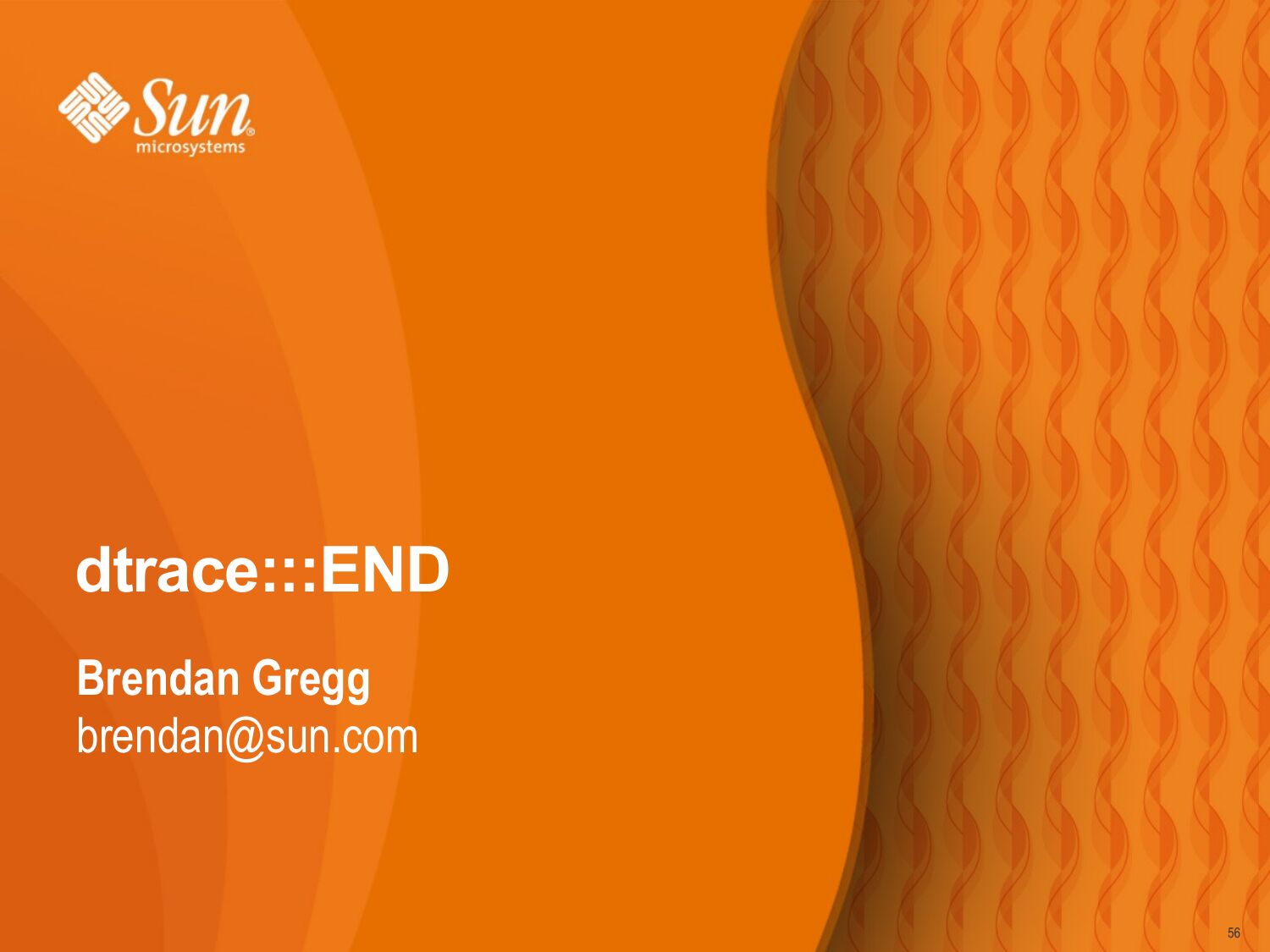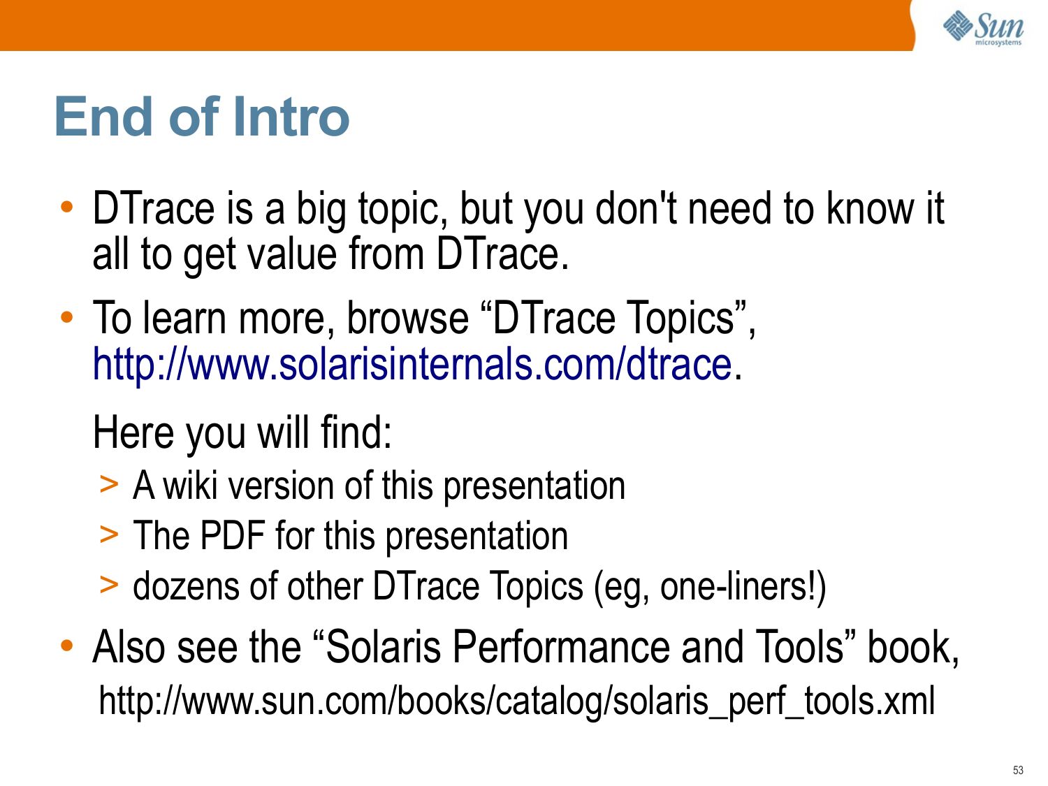 slide 53:End of Intro • DTrace is a big topic, but you don't need to know it all to get value from DTrace. • To learn more, browse “DTrace Topics”, http://www.solarisinternals.com/dtrace. Here you will find: >gt; A wiki version of this presentation >gt; The PDF for this presentation >gt; dozens of other DTrace Topics (eg, one-liners!) • Also see the “Solaris Performance and Tools” book, http://www.sun.com/books/catalog/solaris_perf_tools.xmlslide 54: