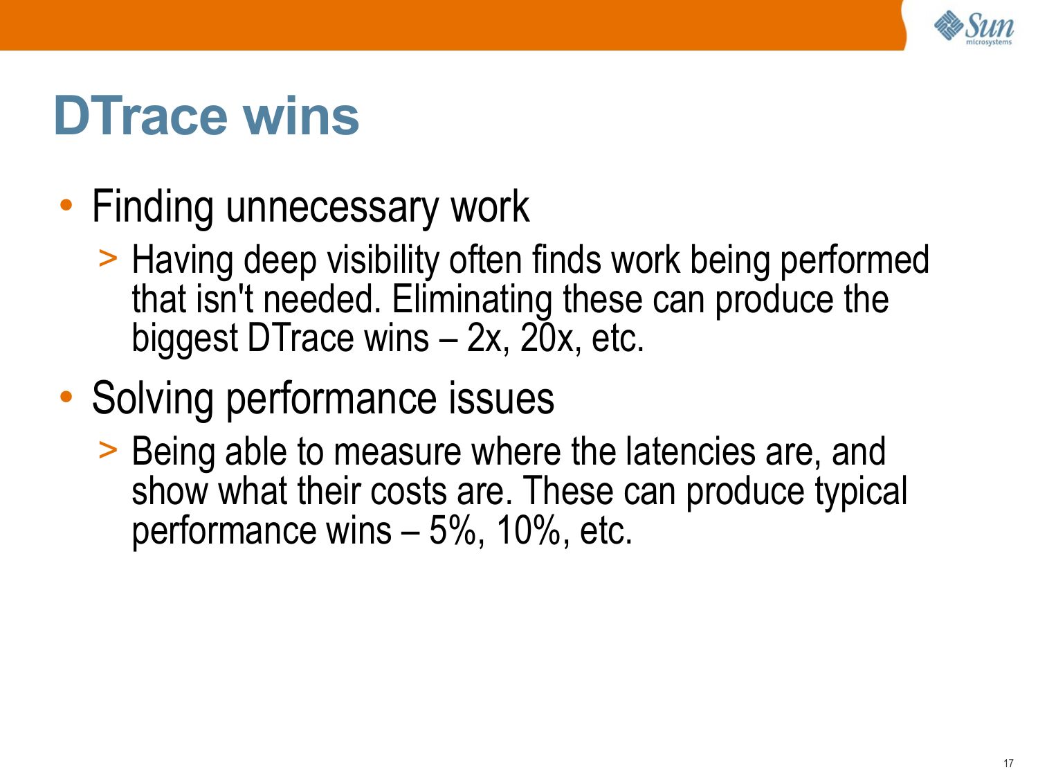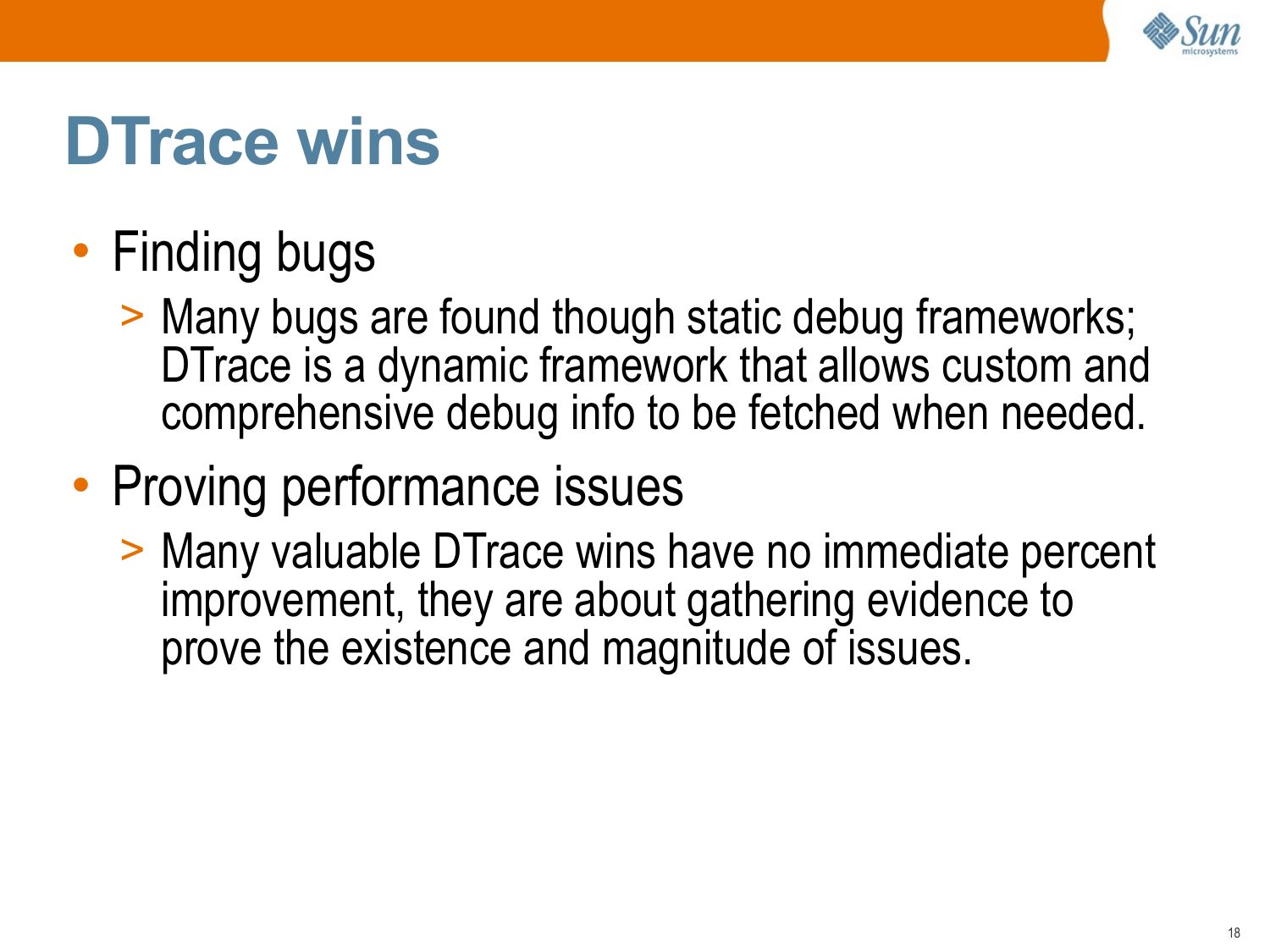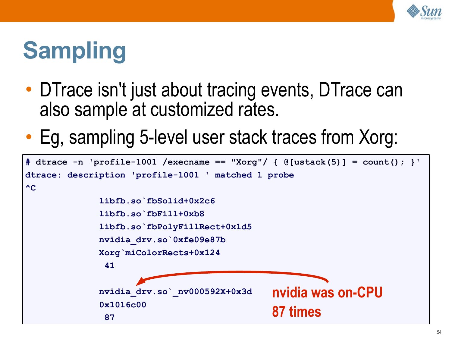slide 53:End of Intro • DTrace is a big topic, but you don't need to know it all to get value from DTrace. • To learn more, browse “DTrace Topics”, http://www.solarisinternals.com/dtrace. Here you will find: >gt; A wiki version of this presentation >gt; The PDF for this presentation >gt; dozens of other DTrace Topics (eg, one-liners!) • Also see the “Solaris Performance and Tools” book, http://www.sun.com/books/catalog/solaris_perf_tools.xmlslide 54: