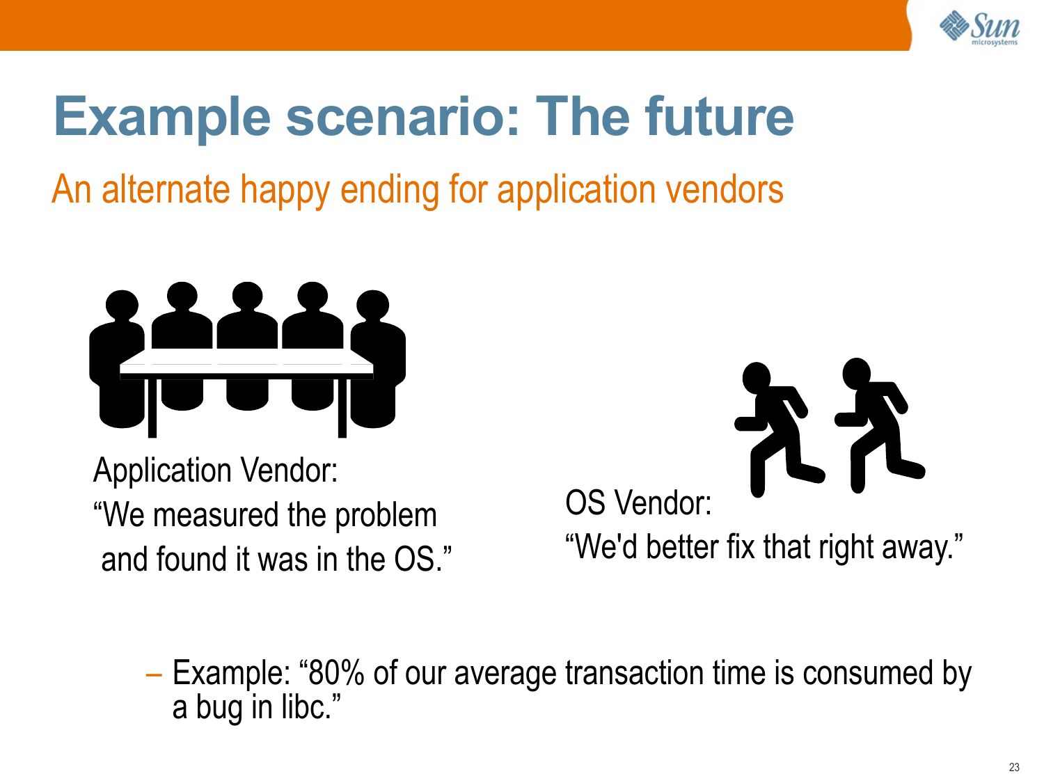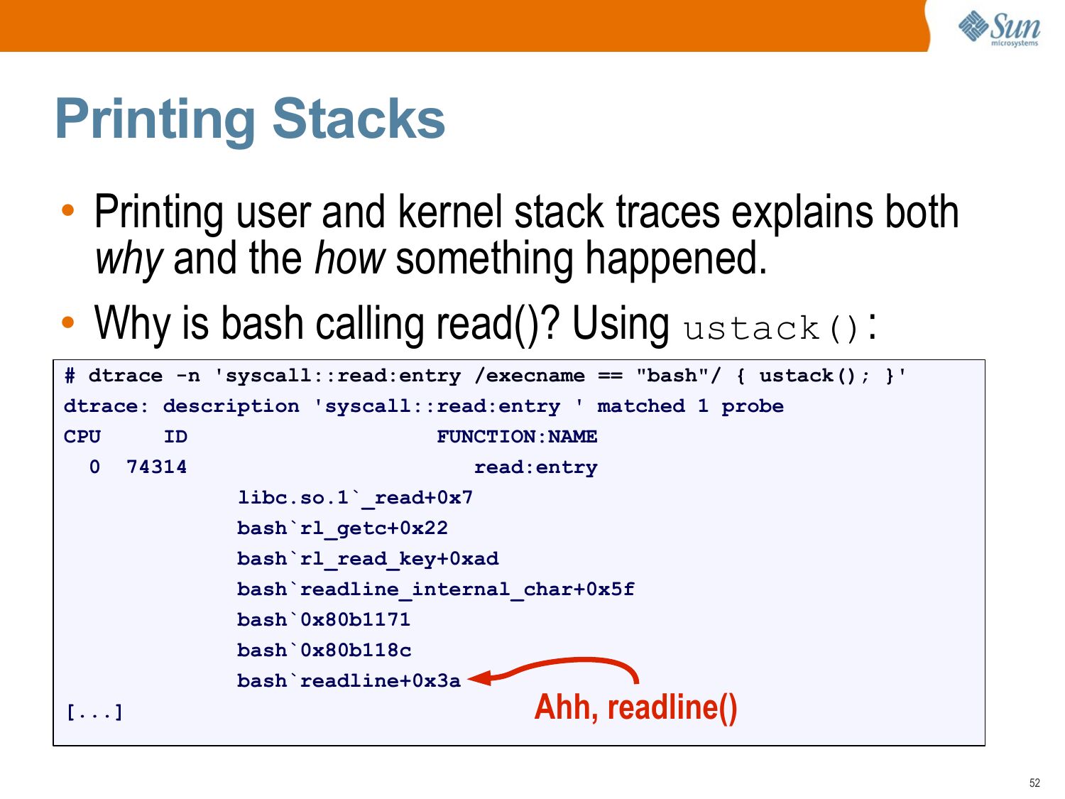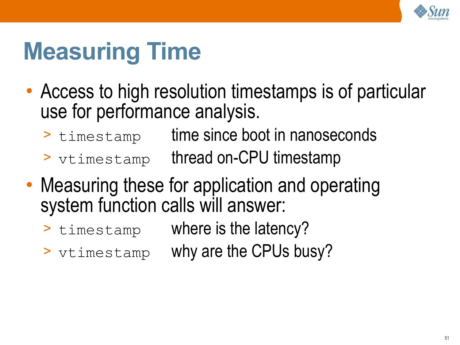 Measuring Time • Access to high resolution timestamps is of particular use for performance analysis. >gt; timestamp >gt; vtimestamp time since boot in nanoseconds thread on-CPU timestamp • Measuring these for application and operating system function calls will answer: >gt; timestamp >gt; vtimestamp where is the latency? why are the CPUs busy?slide 52: