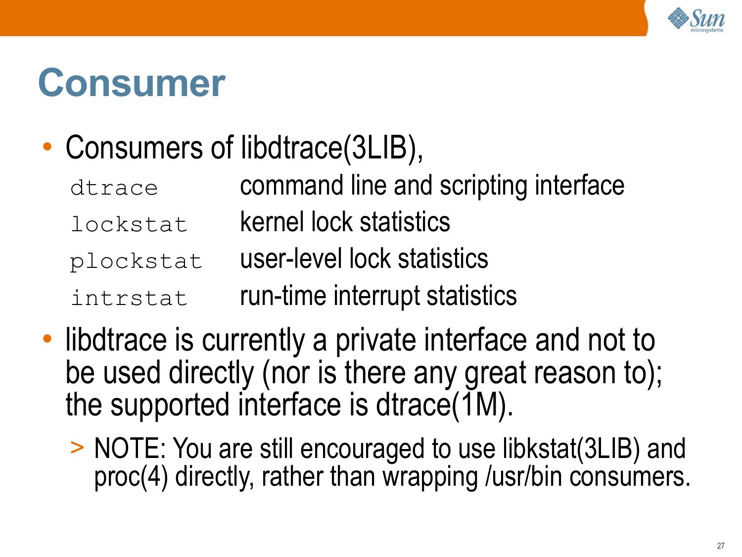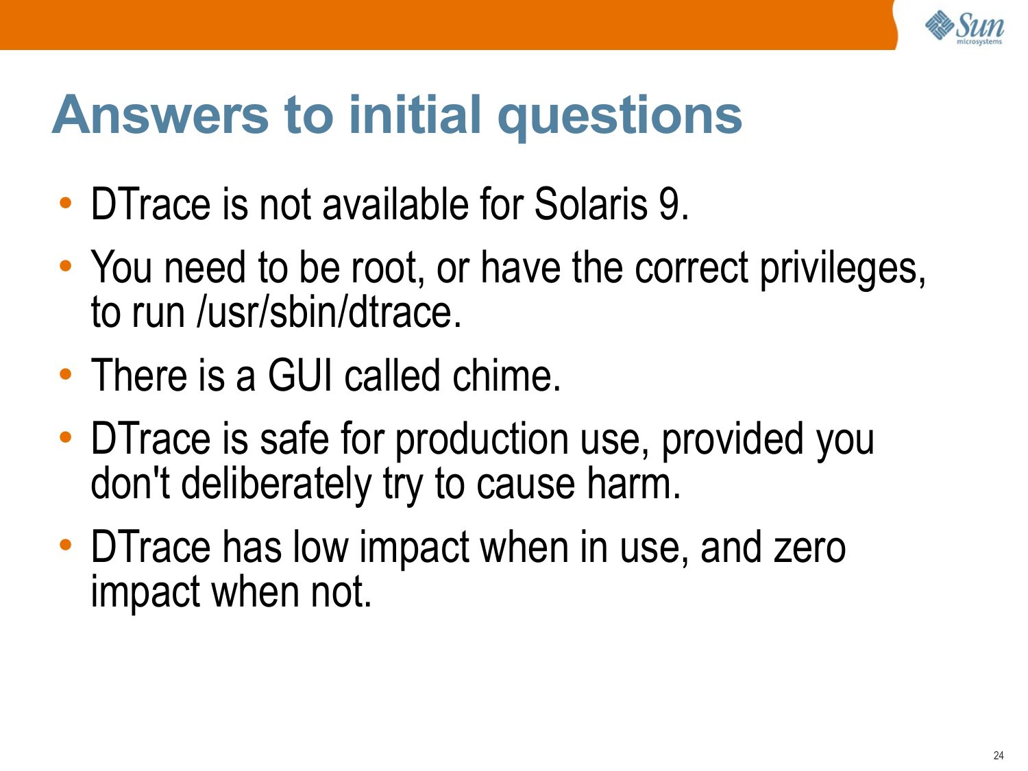 Description: "Introduction to DTrace (Dynamic Tracing), written by Brendan Gregg and delivered in 2007. While aimed at a Solaris-based audience, this introduction is still largely relevant today (2012). Since then, DTrace has appeared in other operating systems (Mac OS X, FreeBSD, and is being ported to Linux), and, many user-level providers have been developed to aid tracing of other languages."| next prev 1/56 | |