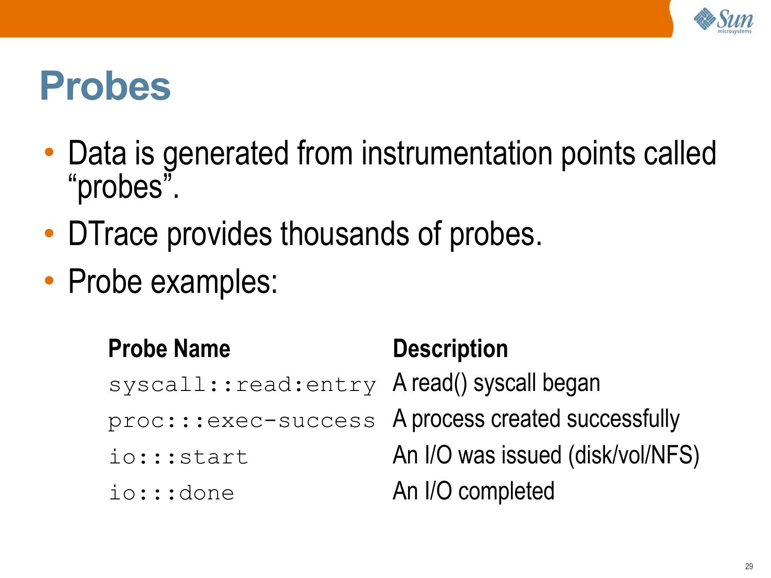 Probes • Data is generated from instrumentation points called “probes”. • DTrace provides thousands of probes. • Probe examples: Probe Name Description syscall::read:entry A read() syscall began proc:::exec-success A process created successfully io:::start An I/O was issued (disk/vol/NFS) io:::done An I/O completedslide 30: