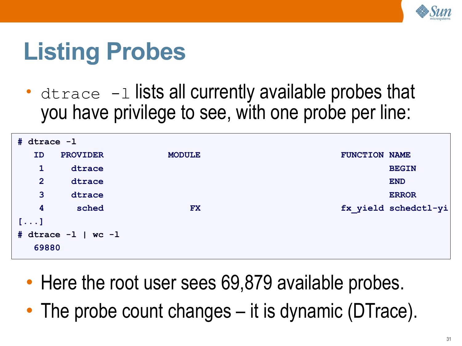 Listing Probes • dtrace -l lists all currently available probes that you have privilege to see, with one probe per line: # dtrace -l PROVIDER dtrace dtrace dtrace sched [...] # dtrace -l | wc -l MODULE FUNCTION NAME BEGIN END ERROR fx_yield schedctl-yi • Here the root user sees 69,879 available probes. • The probe count changes – it is dynamic (DTrace).slide 32: