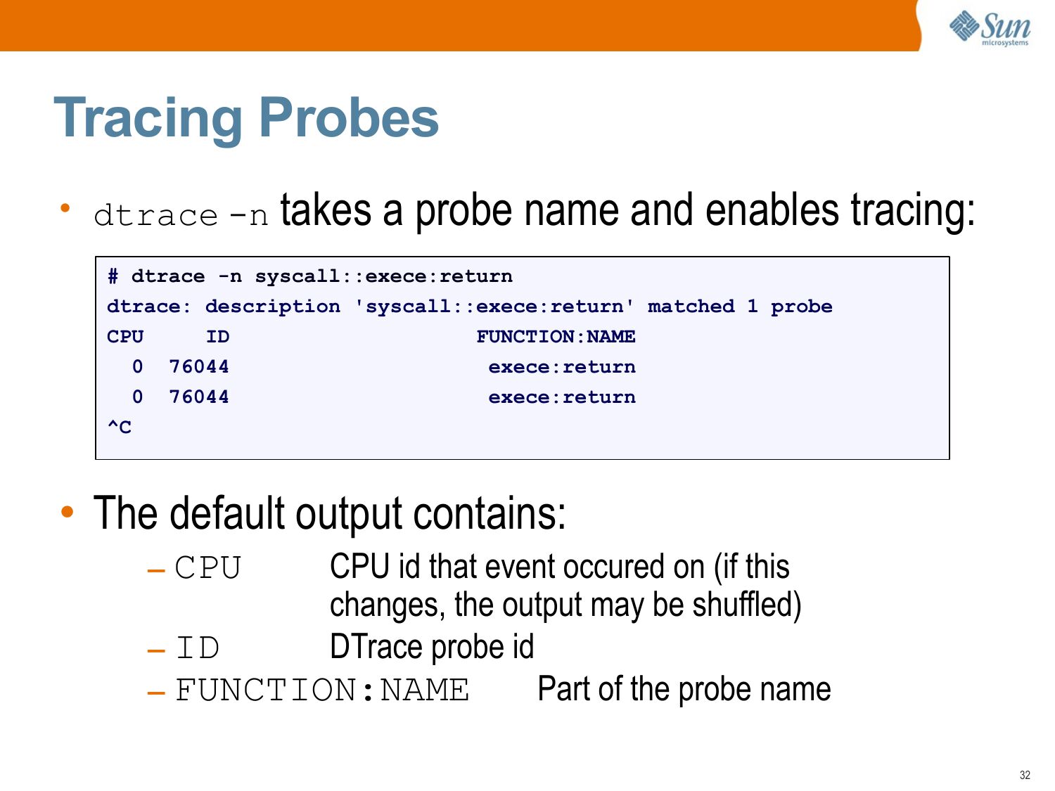 Tracing Probes • dtrace -n takes a probe name and enables tracing: # dtrace -n syscall::exece:return dtrace: description 'syscall::exece:return' matched 1 probe CPU FUNCTION:NAME 0 76044 exece:return 0 76044 exece:return • The default output contains: CPU id that event occured on (if this changes, the output may be shuffled) DTrace probe id – ID Part of the probe name – FUNCTION:NAME – CPUslide 33: