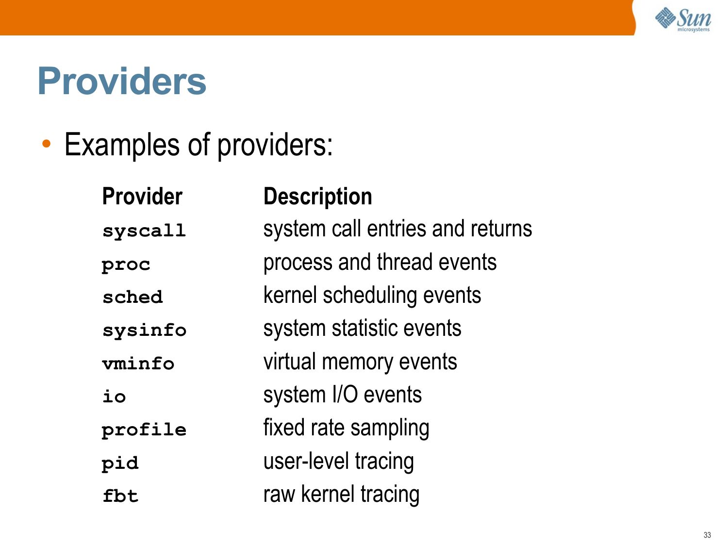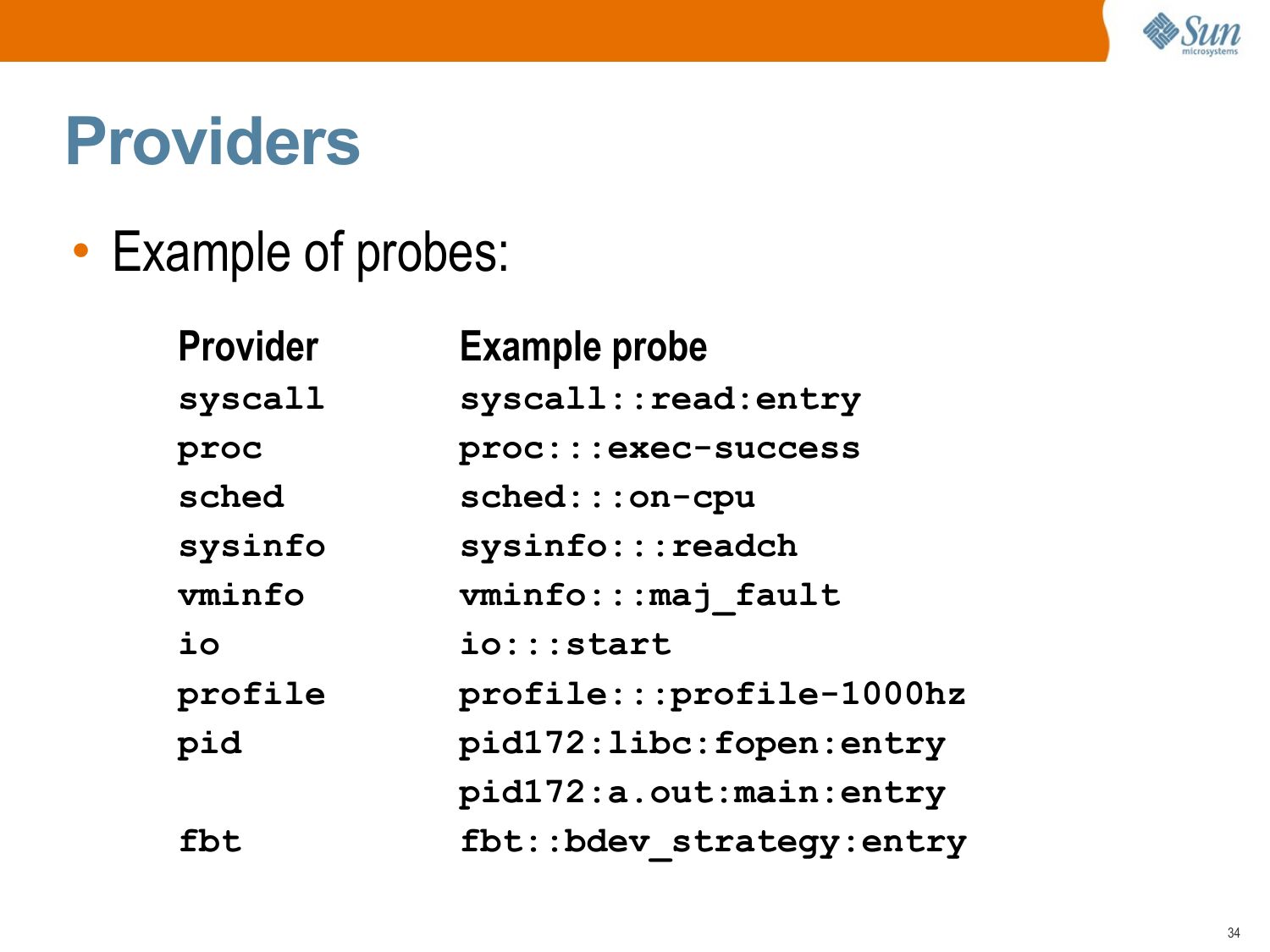 Providers • Examples of providers: Provider syscall proc sched sysinfo vminfo profile pid fbt Description system call entries and returns process and thread events kernel scheduling events system statistic events virtual memory events system I/O events fixed rate sampling user-level tracing raw kernel tracingslide 34: