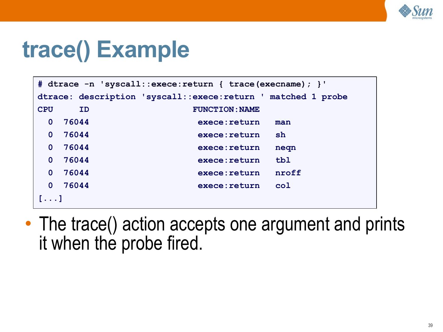 Actions • When a probe fires, an action executes. • Actions are written in the D programming language. • Actions can: >gt; print output >gt; save data to variables, and perform calculations >gt; walk kernel or process memory • With destruction actions allowed, actions can: >gt; raise signals on processes >gt; execute shell commands >gt; write to some areas of memoryslide 39: