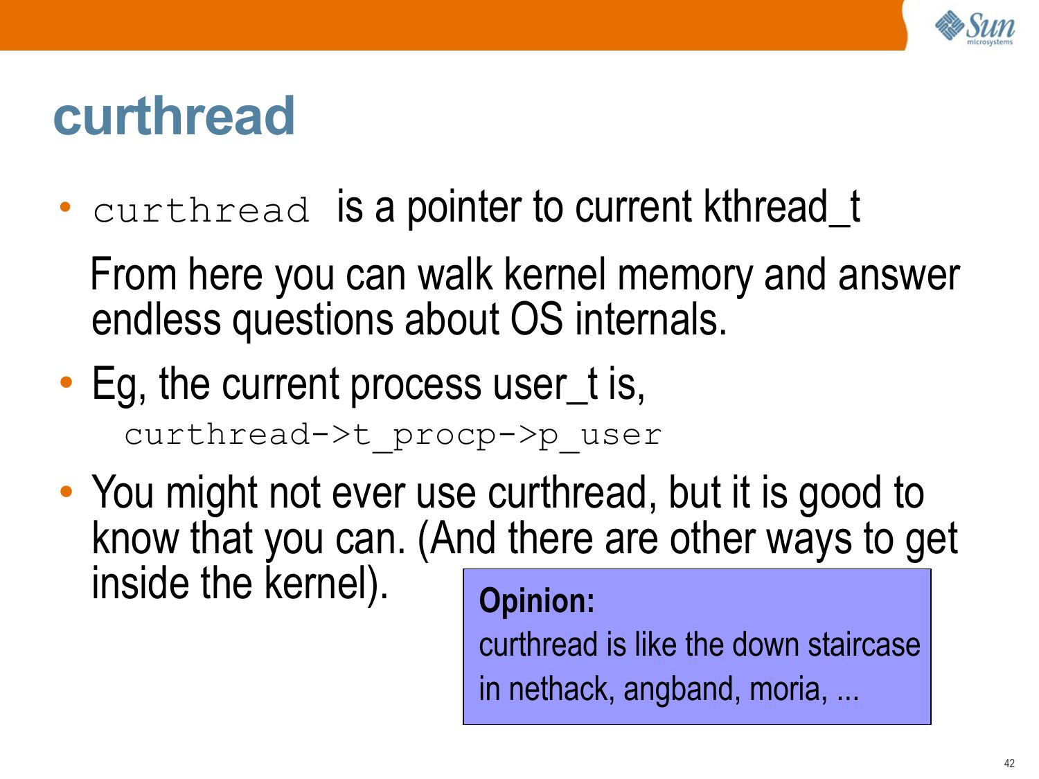 curthread • curthread is a pointer to current kthread_t From here you can walk kernel memory and answer endless questions about OS internals. • Eg, the current process user_t is, curthread->gt;t_procp->gt;p_user • You might not ever use curthread, but it is good to know that you can. (And there are other ways to get inside the kernel). Opinion: curthread is like the down staircase in nethack, angband, moria, ...slide 43: