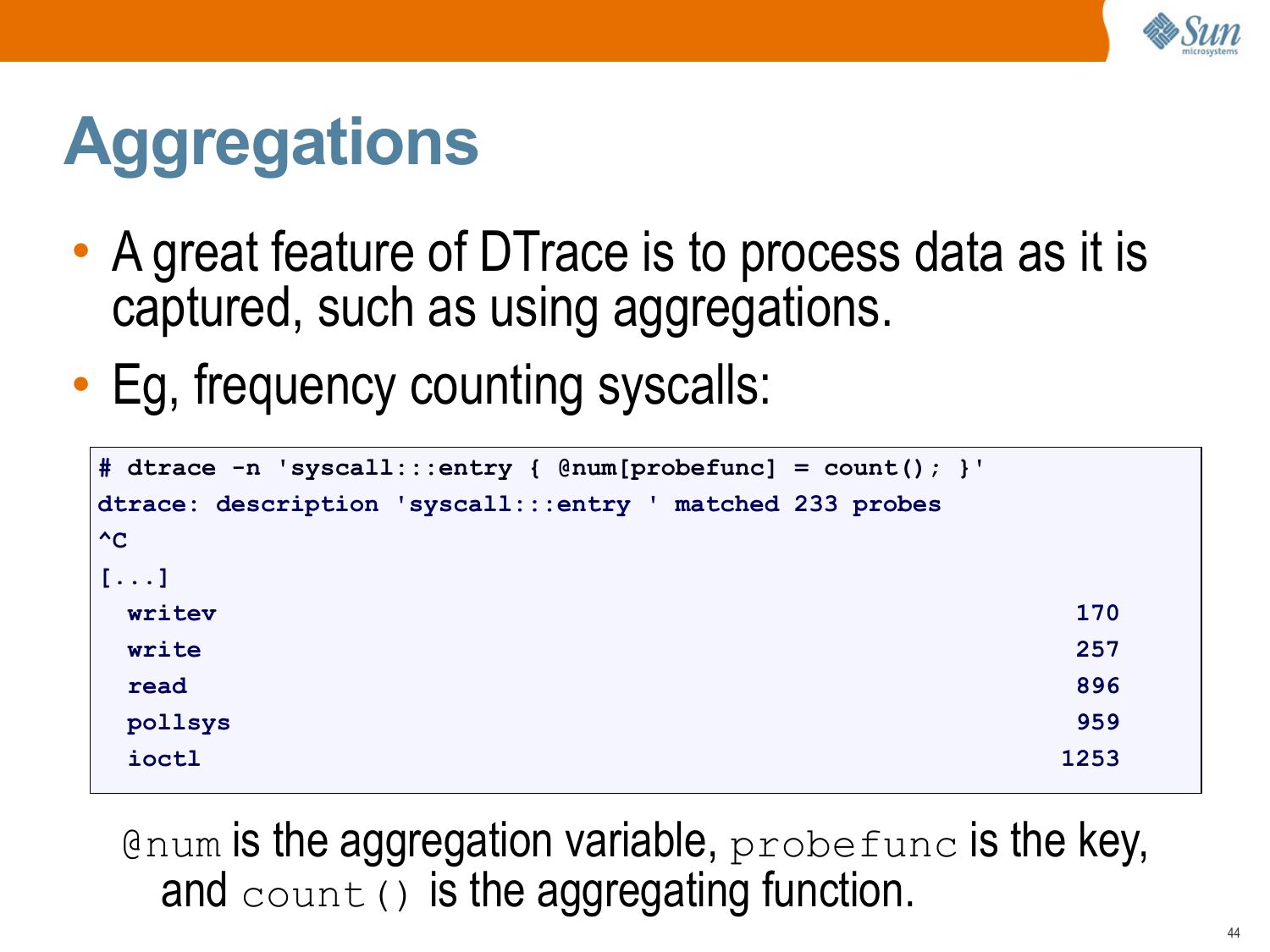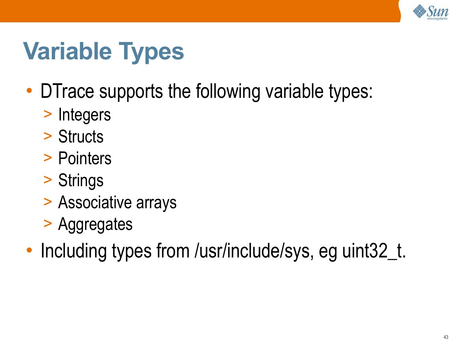 Variable Types • DTrace supports the following variable types: >gt; Integers >gt; Structs >gt; Pointers >gt; Strings >gt; Associative arrays >gt; Aggregates • Including types from /usr/include/sys, eg uint32_t.slide 44: