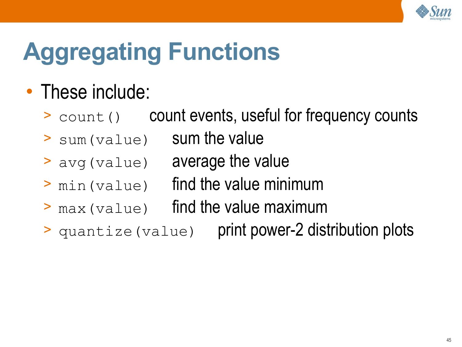 slide 45:Aggregating Functions • These include: count events, useful for frequency counts >gt; sum(value) sum the value >gt; avg(value) average the value >gt; min(value) find the value minimum >gt; max(value) find the value maximum >gt; quantize(value) print power-2 distribution plots >gt; count()slide 46: