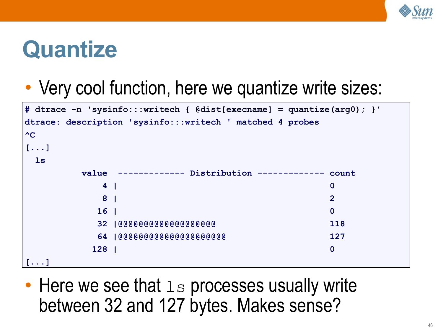 # dtrace -n 'sysinfo:::writech { @dist[execname] = quantize(arg0); }'