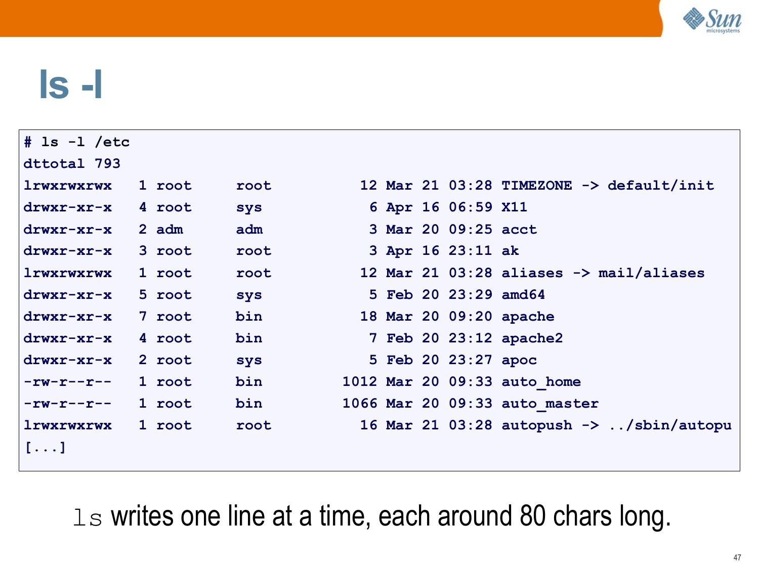 slide 47:ls -l # ls -l /etc dttotal 793 lrwxrwxrwx 1 root drwxr-xr-x 4 root drwxr-xr-x 2 adm drwxr-xr-x 3 root lrwxrwxrwx 1 root drwxr-xr-x 5 root drwxr-xr-x 7 root drwxr-xr-x 4 root drwxr-xr-x 2 root -rw-r--r-1 root -rw-r--r-1 root lrwxrwxrwx 1 root [...] root sys adm root root sys bin bin sys bin bin root 12 Mar 21 03:28 TIMEZONE ->gt; default/init 6 Apr 16 06:59 X11 3 Mar 20 09:25 acct 3 Apr 16 23:11 ak 12 Mar 21 03:28 aliases ->gt; mail/aliases 5 Feb 20 23:29 amd64 18 Mar 20 09:20 apache 7 Feb 20 23:12 apache2 5 Feb 20 23:27 apoc 1012 Mar 20 09:33 auto_home 1066 Mar 20 09:33 auto_master 16 Mar 21 03:28 autopush ->gt; ../sbin/autopu ls writes one line at a time, each around 80 chars long.slide 48: