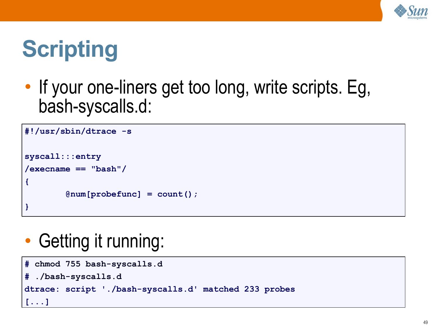 slide 49:Scripting • If your one-liners get too long, write scripts. Eg, bash-syscalls.d: #!/usr/sbin/dtrace -s syscall:::entry /execname == "bash"/ @num[probefunc] = count(); • Getting it running: # chmod 755 bash-syscalls.d # ./bash-syscalls.d dtrace: script './bash-syscalls.d' matched 233 probes [...]slide 50: