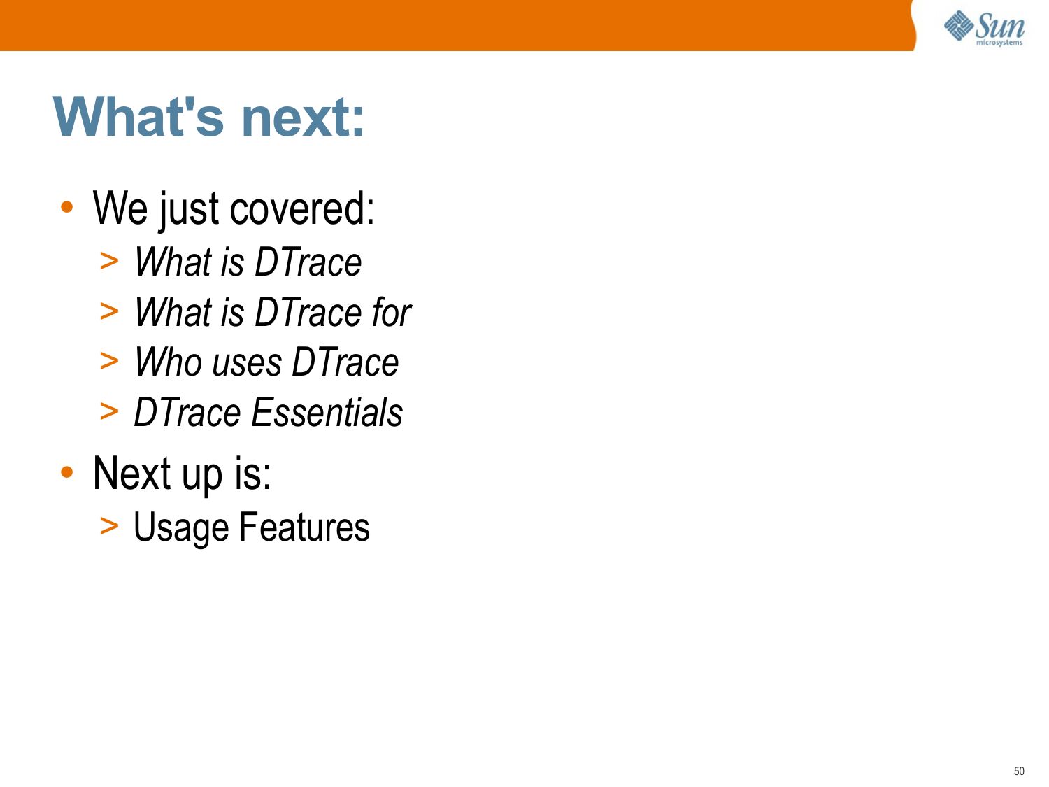 What's next: • We just covered: >gt; What is DTrace >gt; What is DTrace for >gt; Who uses DTrace >gt; DTrace Essentials • Next up is: >gt; Usage Featuresslide 51: