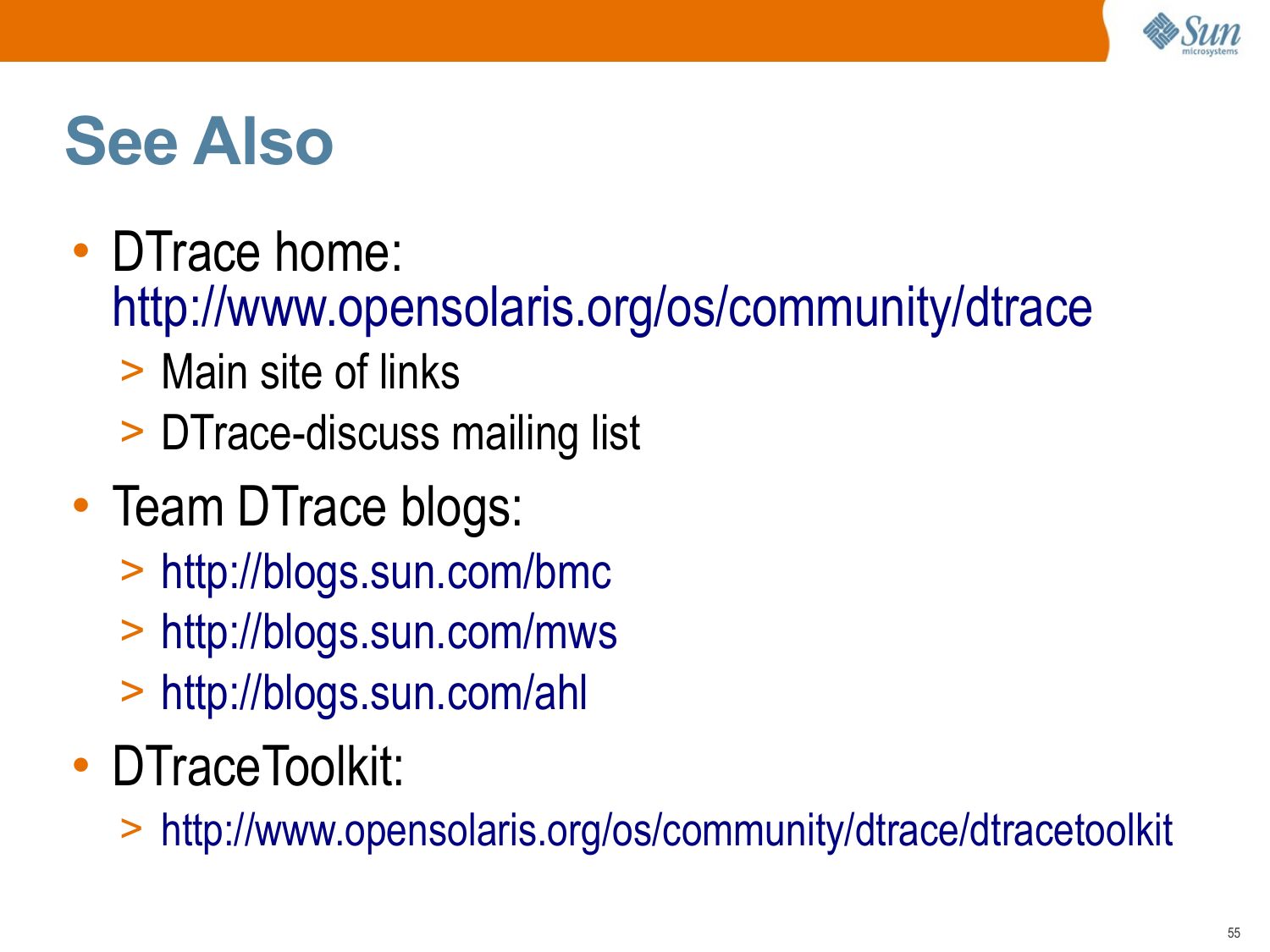 slide 55:See Also • DTrace home: http://www.opensolaris.org/os/community/dtrace >gt; Main site of links >gt; DTrace-discuss mailing list • Team DTrace blogs: >gt; http://blogs.sun.com/bmc >gt; http://blogs.sun.com/mws >gt; http://blogs.sun.com/ahl • DTraceToolkit: >gt; http://www.opensolaris.org/os/community/dtrace/dtracetoolkitslide 56:
