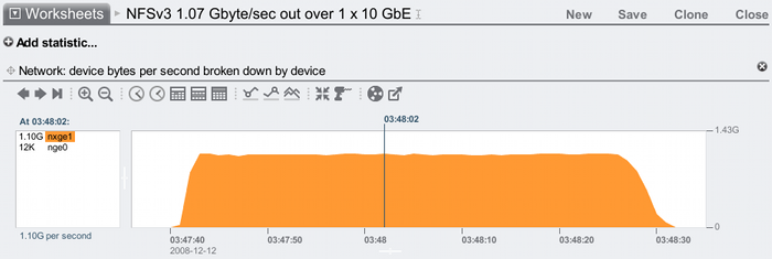 That's 1.07 Gbytes/sec outbound. This includes the network headers, so the NFS payload throughput will be a little less. As a sanity check, we can see from the first screenshot x-axis that the test ran from 03:47:40 to about 03:48:30. We know that 50 Gbytes of total payload was moved over NFS (the shares were mounted before the run, so no client caching), so if this took 50 seconds, our average payload throughput would be about 1 Gbyte/sec. This fits.
