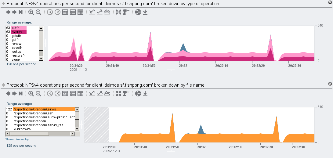 While I was watching, the home directory server for fishworks was serving most of its NFS IOPS for a bug in elinks on my desktop. Which I can eliminate by upgrading my elinks version. This is an example of the best type of performance win: eliminating unnecessary work.
